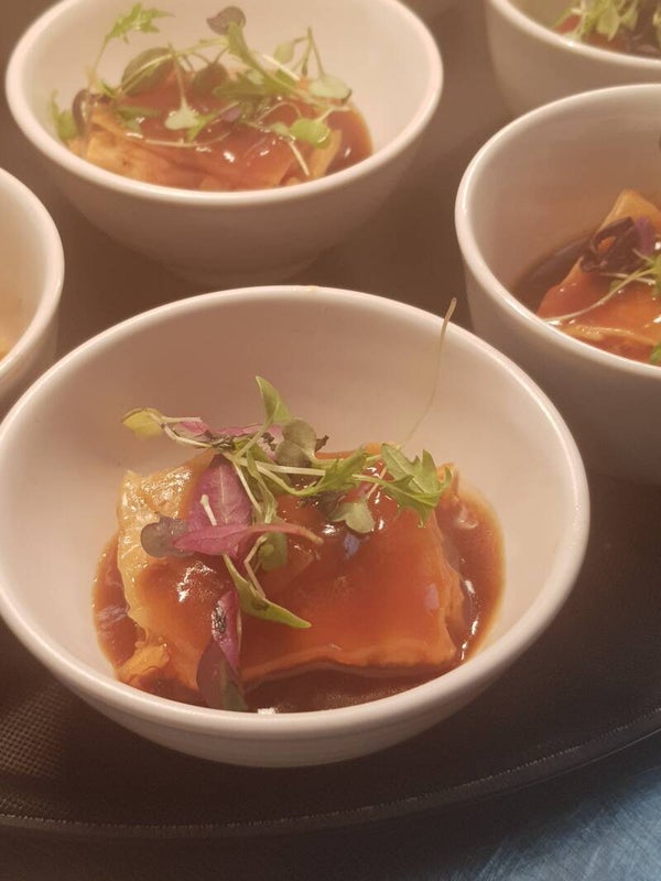 Ricotta & black truffle ravioli, butternut, pea shoots & pesto (V)