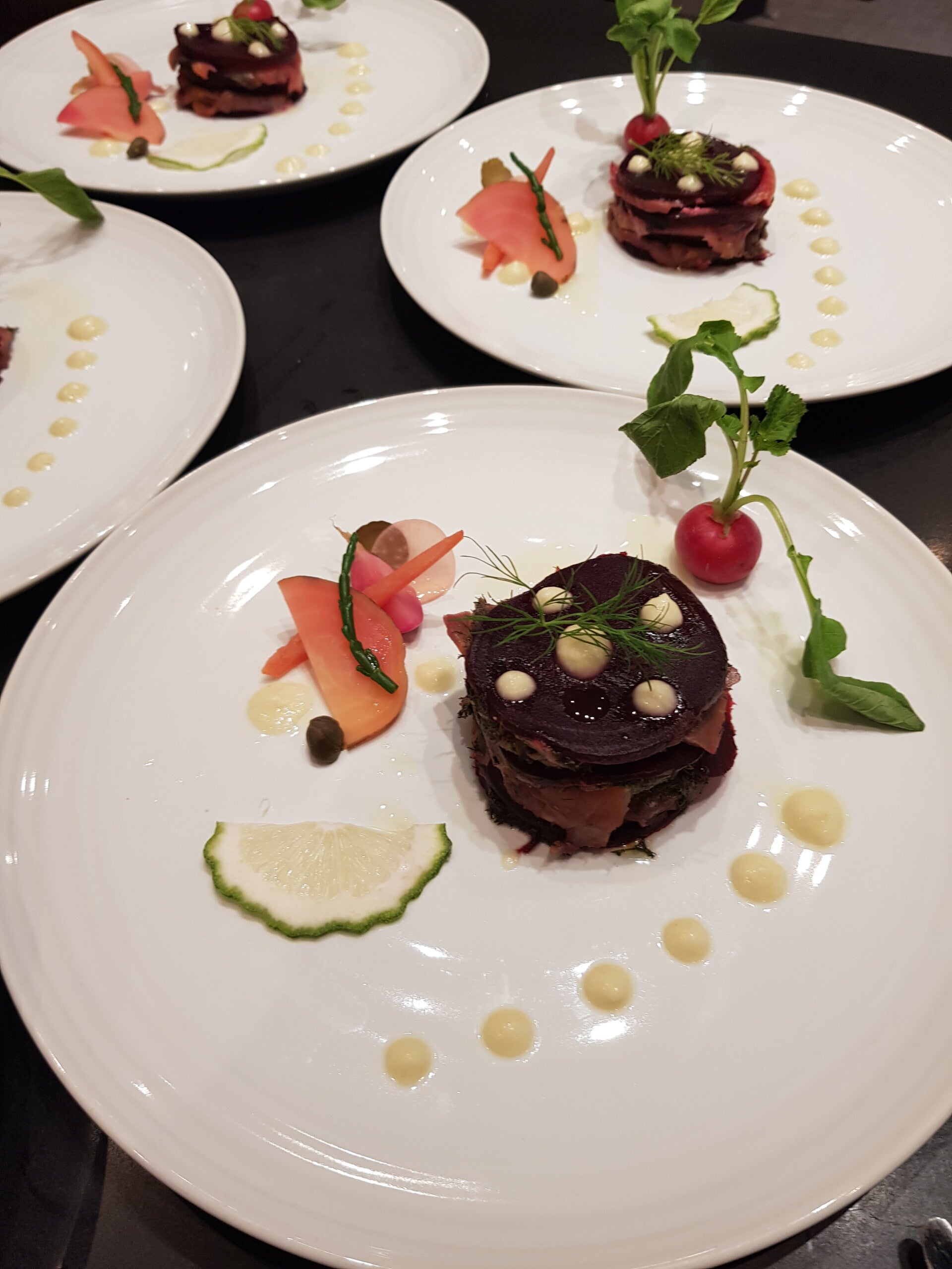 Pan-fried baby Aubergine Tofu Himalayan salt baked beetroot & Noisette potatoes, onion and carrot on rosemary jus.