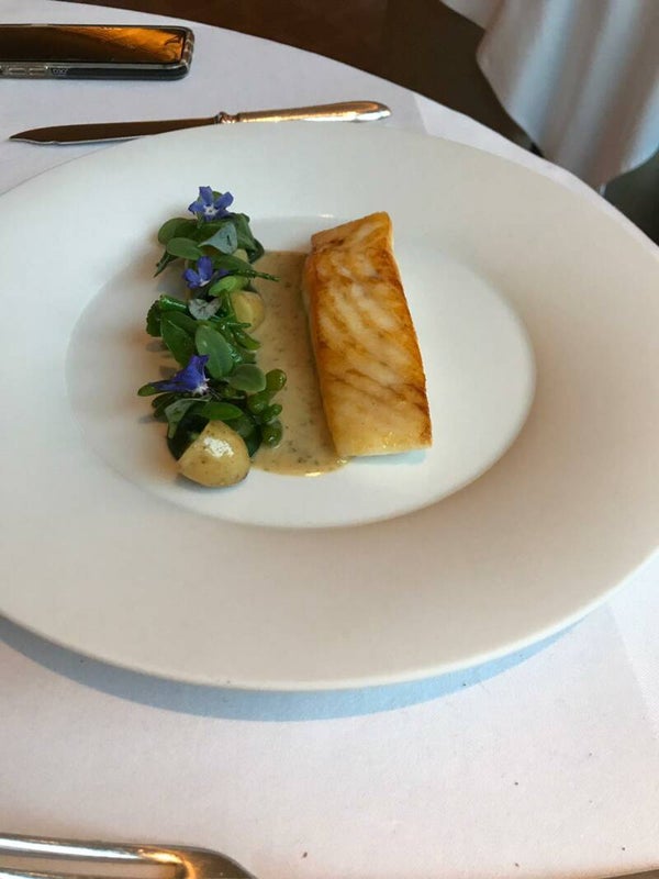 Pan roasted turbot with braised leek, sweet Noisette potatoes. Crab bisque and herbs.