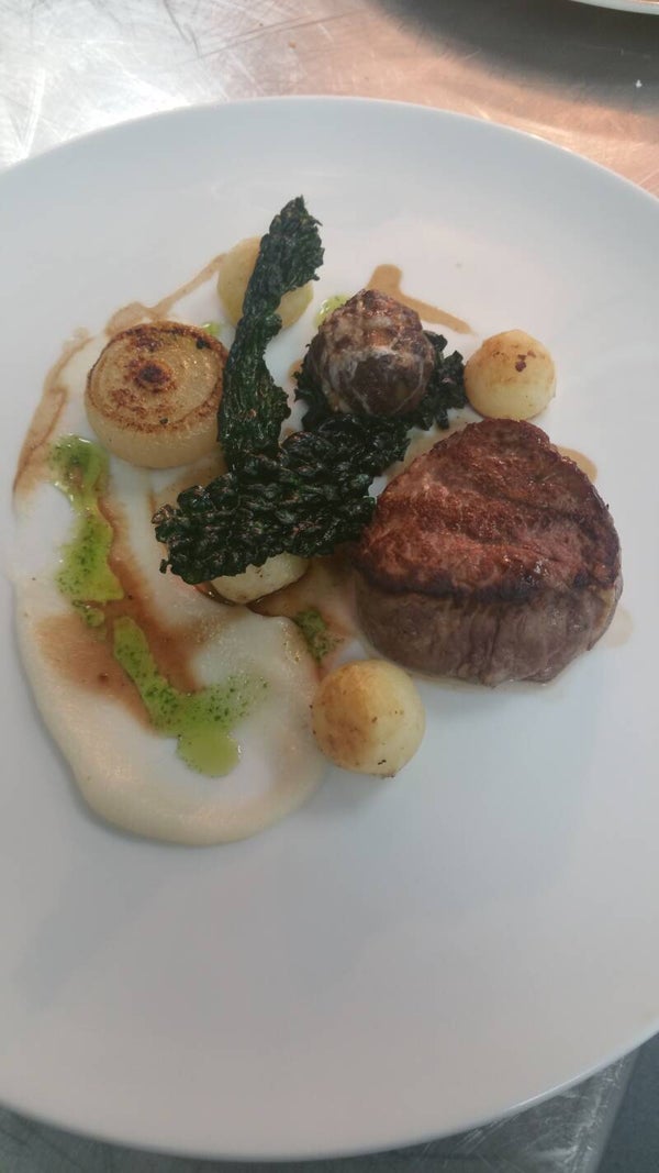 Fillet of venison, Himalayan salt cauliflower puree, aged smoked garlic with mint crisp baby Noisette potatoes, roasted baby onion and carrot with and jus.