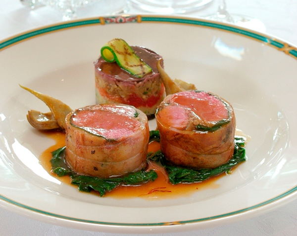 with Pepper & Spice Massage, Smoked Garlic Mushrooms, Truffle Tomato Confit & Tarragon Potato Terrine