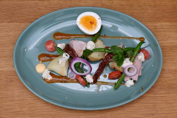 English new season potatoes and green beans, heritage tomatoes red onion wild rocket salad. Wild Tuna with soft boil eggs.